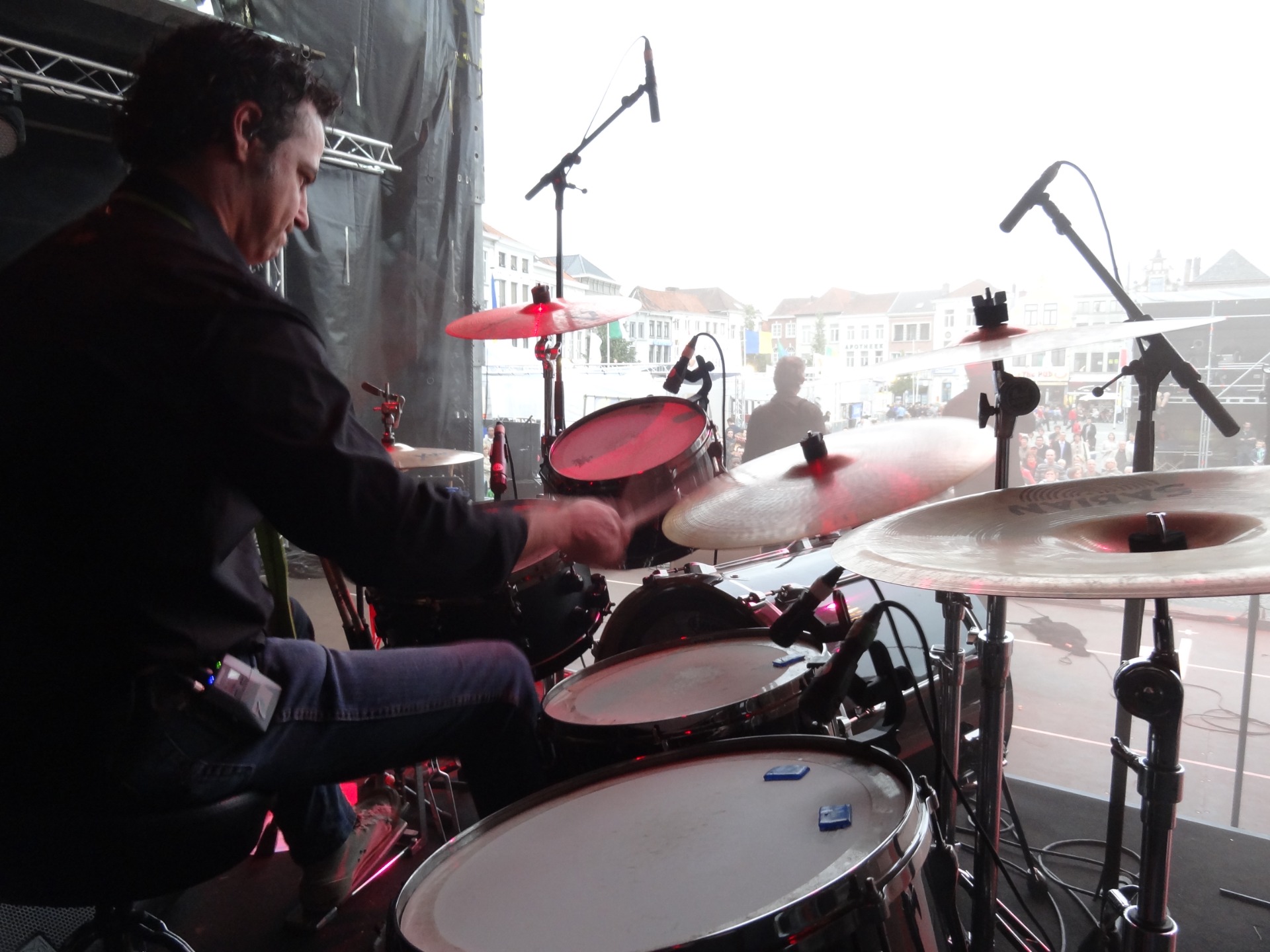 De geluids- en lichtinstallatie wordt opgesteld en bediend door 2 makkers, die jarenlang samen muziek hebben gespeeld. Wim als bassist en ik als drummer.